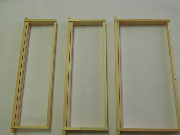 These are high quality bee hive frames. Completely assembled with glue and staples. Ready for wax foundation. We offer wedge top bar and slotted bottom bar (WTB-SBB) or wedge top bar and grooved bottom bar (WTB-GBB) in deep (9 1/8"), medium (6 1/4"), and shallow (5 3/8") variants.